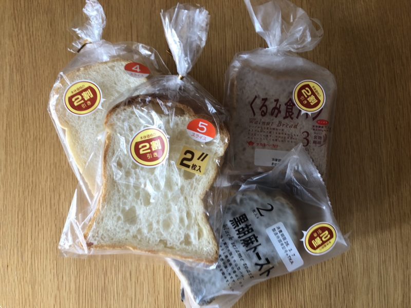 買い物カゴの中は、パン、玉子や肉類、グロッサリー系などなど、割引きシールだらけ。