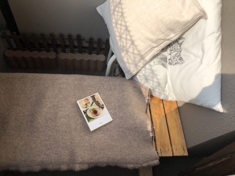 午前中は眩しいけれど、午後1時くらいになると太陽が隠れて丁度良い日光の状態になるのを発見。ここで読書と決め込もう。