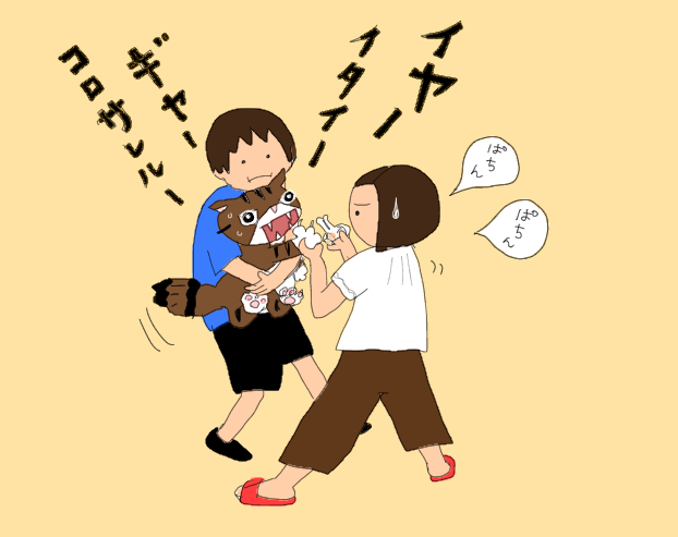 そして「ギャオーギャオー」とわめいて、わたしの手に嚙みついてくる!