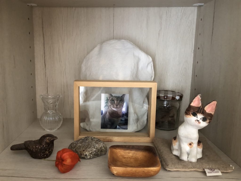 こんな感じで…ここに置いたらどうだろう。遺影は「ポコちゃん」。
