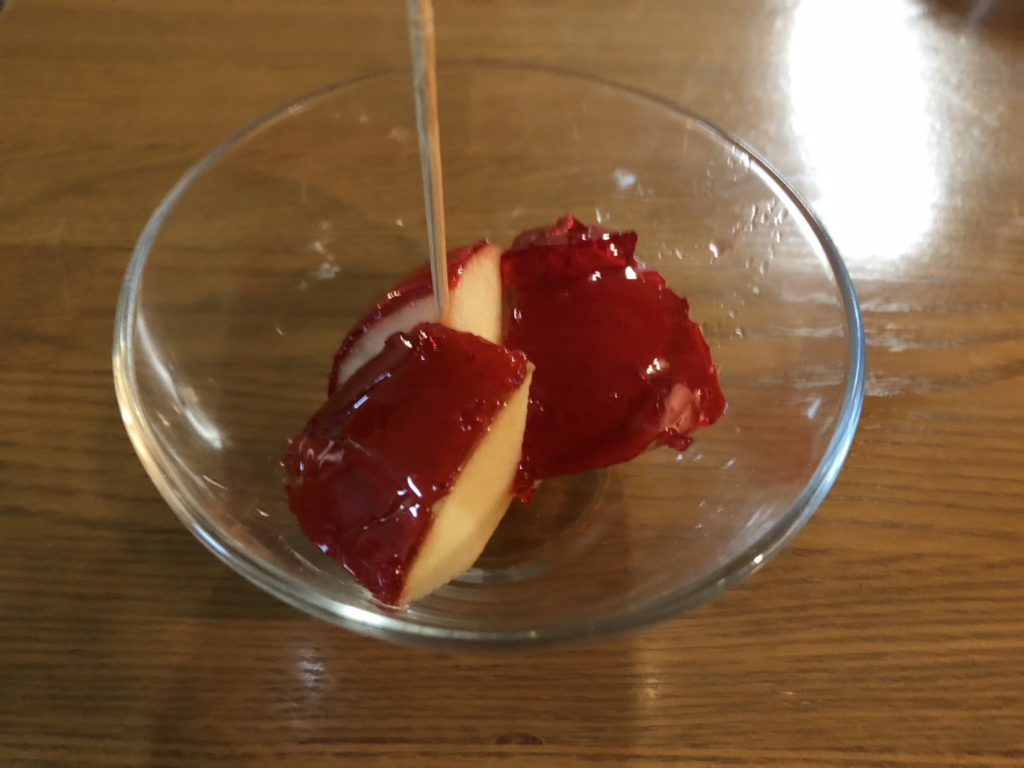 2度目に買ってもらった時、飴の部分をかじってみたらガラスが割れたようになって、りんごが見えた。甘い飴とすっぱいりんごの果汁が合わさって「おいしい!」と完食。…そんなりんご飴の思い出よ。