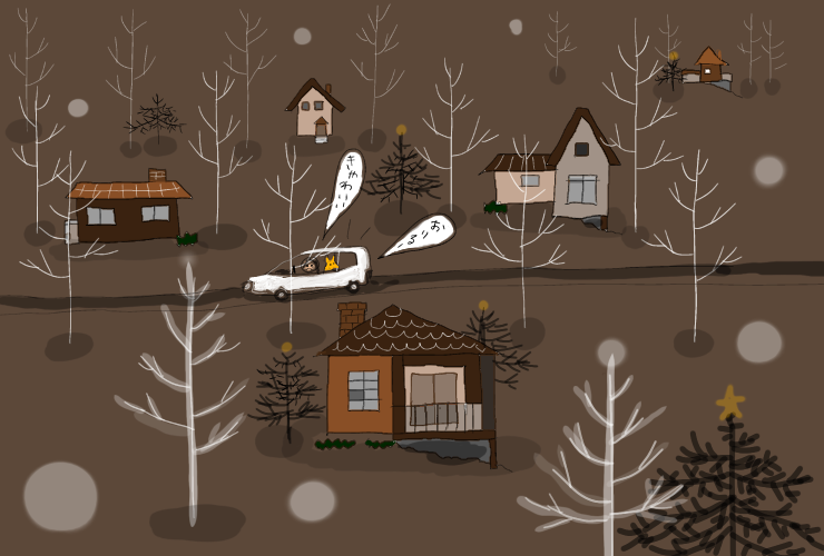 そういうわたしも助手席で「ひゃあひゃあ」うるさい。だって!白樺の林の中の別荘地の山小屋のなんて可愛いことよ!