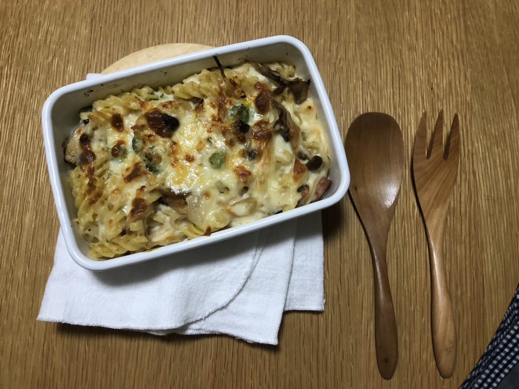 カルディで買ったショートパスタのフジッリがあるから、ホワイトソースを絡めたら…美味しそう。