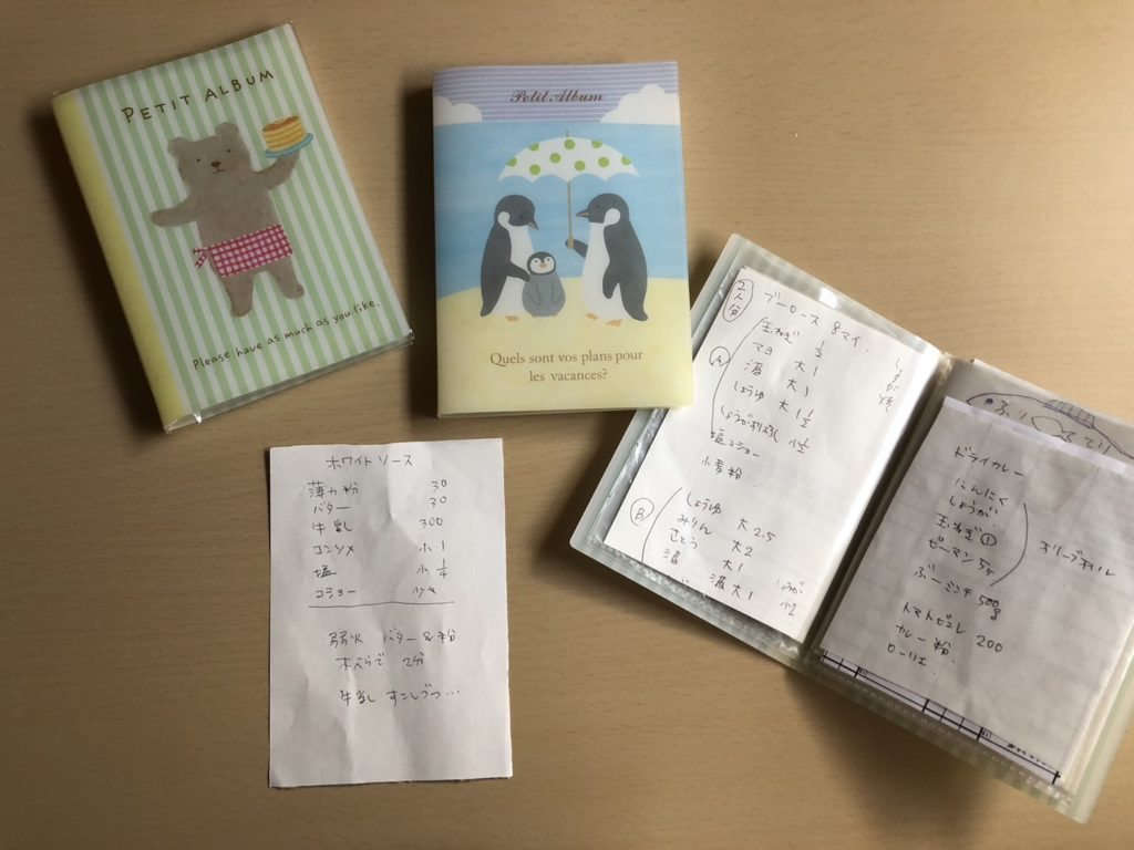 コンパクトで調理の邪魔にならないし、ビニールのポケットは汚れても拭けるところがいい。…ちなみに3冊あるけど、まだ1冊目。