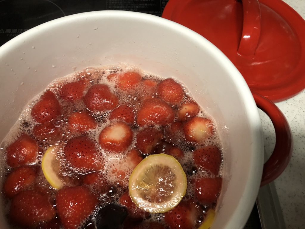 アクを取りながら20分ほど煮る(レモンは冷凍して常備してある)。