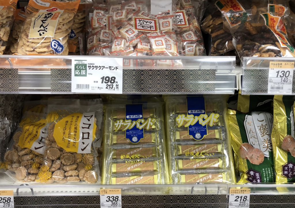 後日の事、いつものスーパーで、老人が好みそうな地味なお菓子コーナー(偏見)を物色するわたし…。ここには前述の「おこし」や、「かりんとう」「炭酸せんべい」など素朴なロングセラー商品がラインナップされている。
