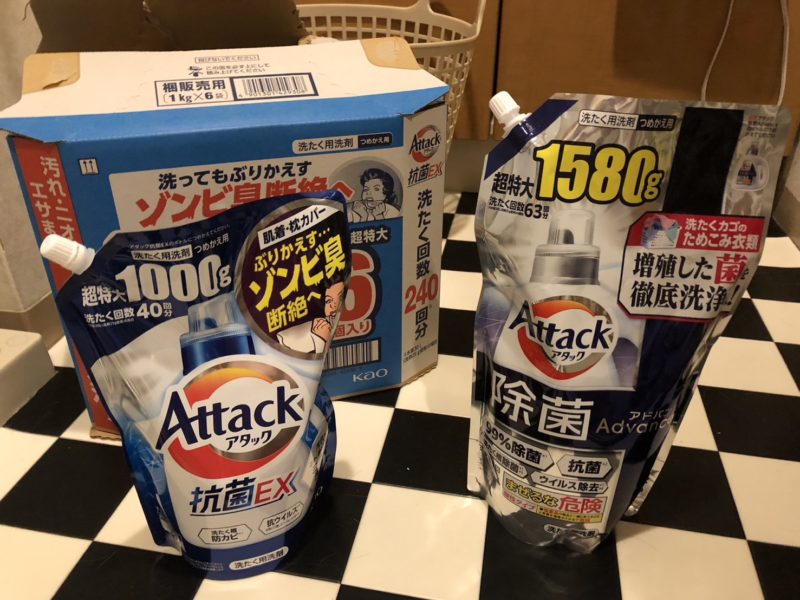 みのちゃんに訴える。「クッサいねん、クッサいねん…」と泣きつく。その時は知らん顔だったみのちゃんだけど、ちゃあんとコストコで買って来てくれた!普通の「アタックEX」それよ、それそれ。写真左のやつね。6袋も買ってくれて…うれしいったら。