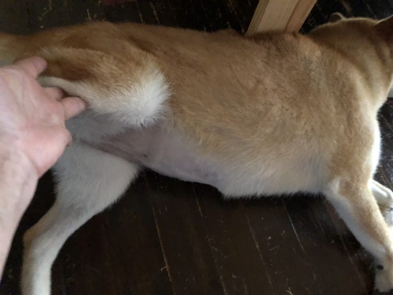 エコー検査の為、毛を刈られたお腹⤵ こぶたちゃん…。