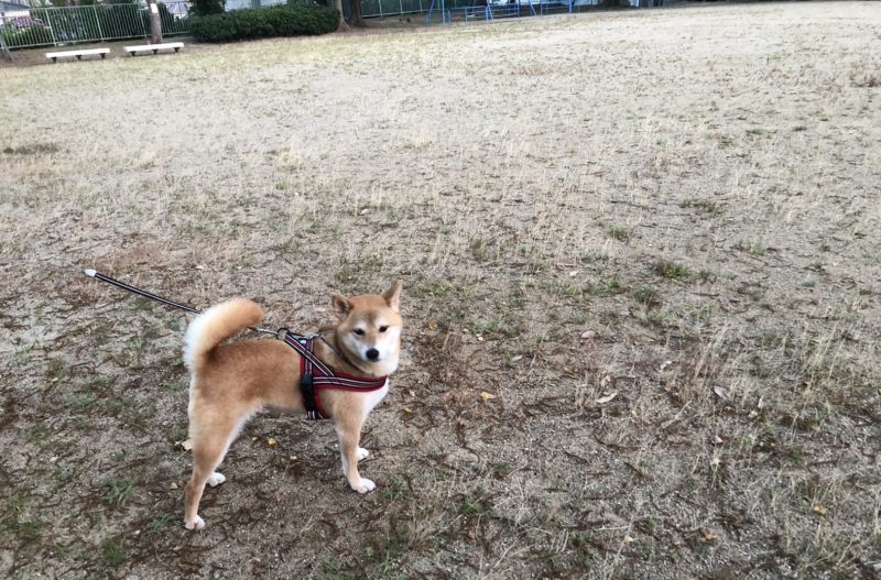 おしっこをして30メートルくらい歩かせただけ。ももは、もっと遊びたそうだけど…ダメよ。