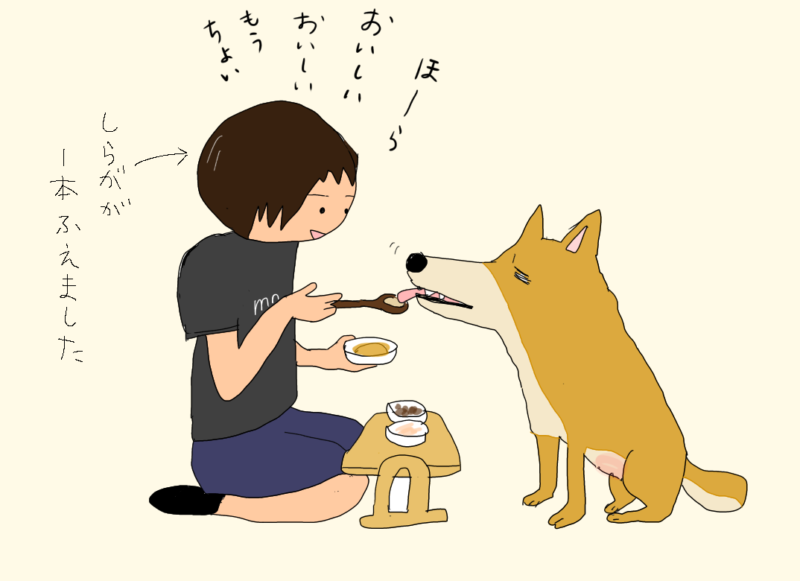 みのちゃんが「これ食べてみる?こっちにする?」と口まで持っていってサポートしてやっと30グラムくらいは食べるかな…という程度。だから1日に4~5回なんとか…少しでも…と食べさせている。