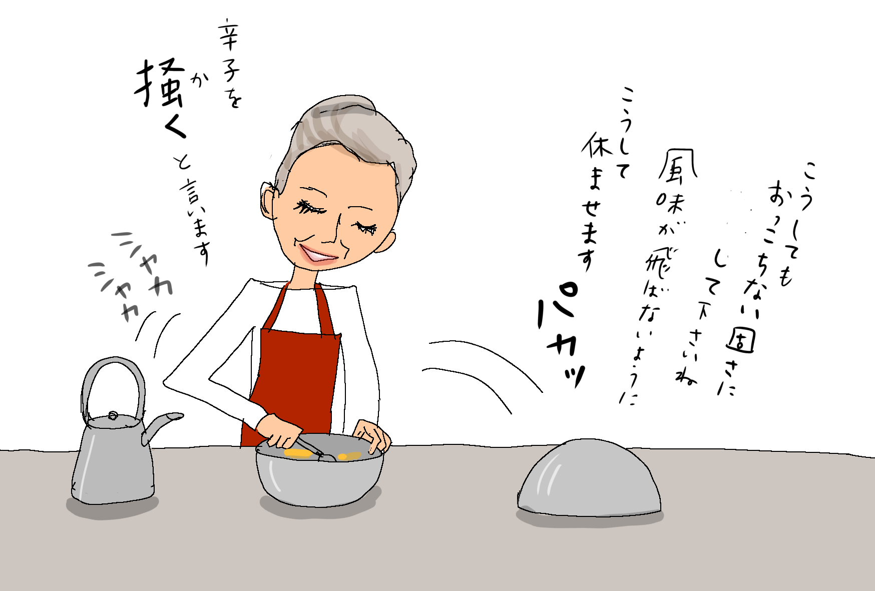 次に、表情がきりっとなって「辛子は『掻く』と言います」と、熱湯を少し加えてガーッとまぜた。「ただ練るんじゃなくて、これを『掻く』動作と言います」そして、そのボウルをパカっとそのまま裏返しにして「こうして休ませておきますと、辛みがぶわ~っと出てきます」…可愛くてお上品な有元葉子さんは82歳?くらい。素敵。