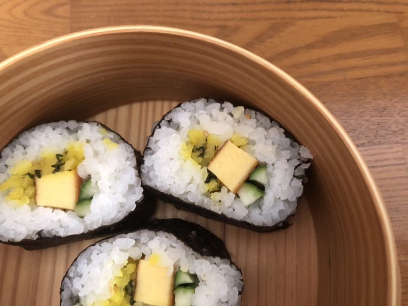 職場からもらってきた魚のアラ(ナントカ鯛?)を炊いたり、巻きずしをちゃちゃっと作ってくれた。巻きずしはサラダ巻きと簡単な海苔巻き2種。