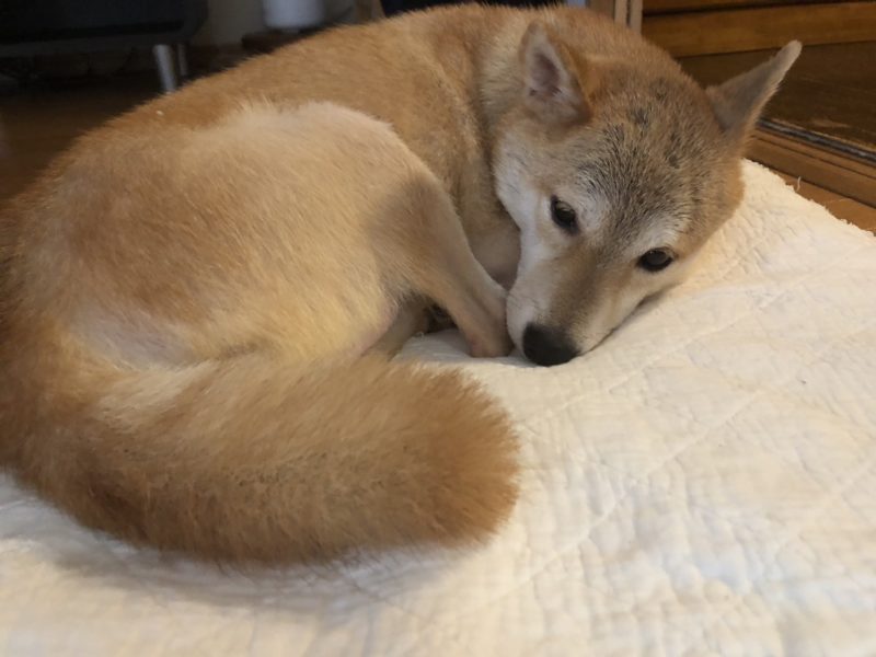 トイレ(シート)に小走りで駆け込んで…3回目は少し血便だった。お腹が痛いのだろう。まあるくなって寝てばかり。⤵