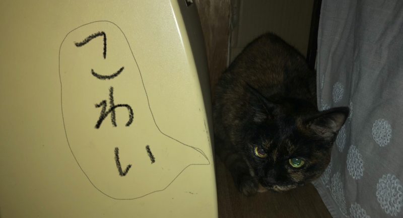 ちびちゃん、押入れに隠れて、ニャーニャー(怖い怖い)と訴える。⤵