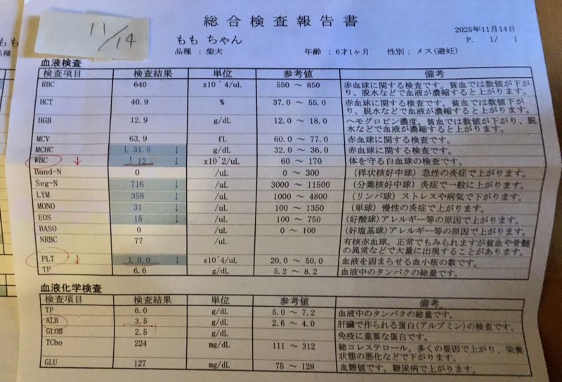 血液検査の数値(もちろん悪い↓)から判断して、抗がん剤を1週間ストップする事になった。ここにきて投薬のバランス?が難しくなった様子。