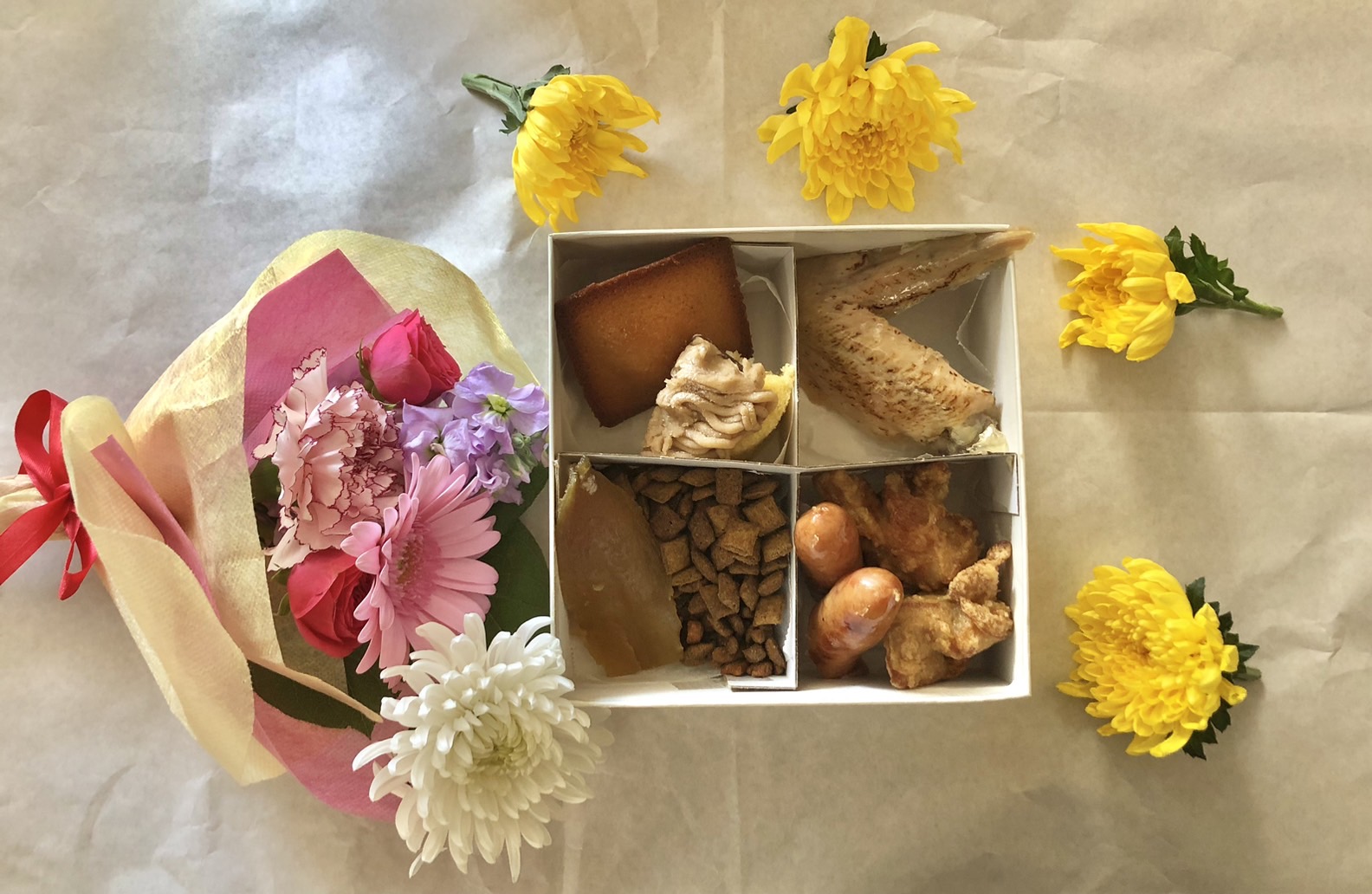 わたしはお花と、鶏の唐揚げ(2個入り)を買って来たわ。