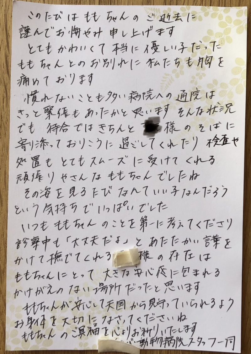 病院側からしたら、わたし達は沢山の中の1患者に過ぎないし、ましてや扱うのは短い命の動物達である。こうやってお悔やみ状を下さるのも業務の一環であろう。手の空いたスタッフの誰かに書かせたのかもしれない。