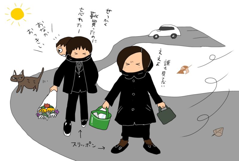わたしは喪服だけれど、分厚い黒タイツにウールのもこもこ靴下を履いた。足元が寒いのは耐えられないからだ。そうすると革靴が入らないので普段履きのスリッポン(黒)を履くしかない。が、誰も咎める者はいないだろう…と考える。そして大昔に買った黒いオーバーコートを着て、寒さ対策をバッチリにした。